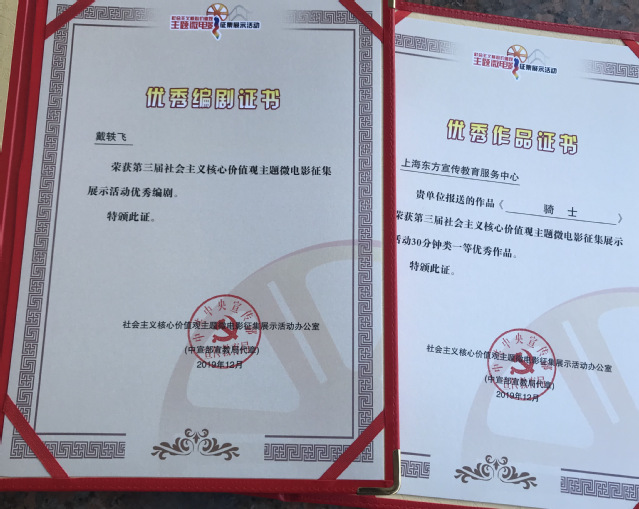 2019年12月14日,由中宣部宣教局、中央网信办网络新闻信息传播局、广电总局传媒司等组织联合开展的第三届社会主义核心价值观主题微电影征集展示活动评审结果揭晓,公司2018届影视导演MFA毕业生戴轶飞荣获第三届社会主义核心价值观主题微电影征集活动优秀编剧,微电影作品《骑士》同时荣获第三届社会主义核心价值观主题微电影征集展示活动30分钟类一等优秀作品,指导老师方虹。