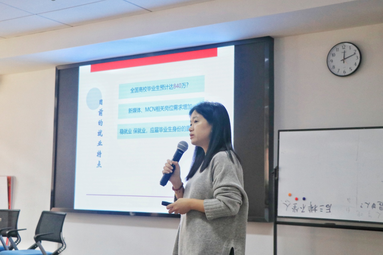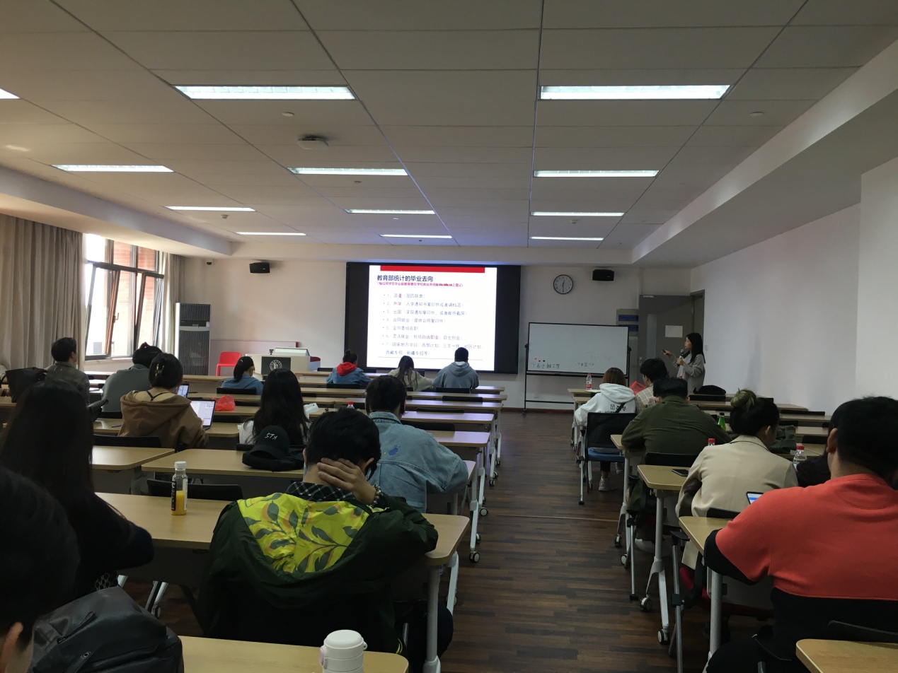 张国丽老师首先从全国高校毕业生预计总人数、社会岗位需求、应届毕业生总体特点等方面介绍了目前严峻的就业形势。她希望同学们一要认清当前就业形势,用积极的态度去对待已经到来的求职之路;二是从思想和行动上下功夫,明确自身定位,精心准备;三是要及时了解国家、上海市、公司等相关就业信息。