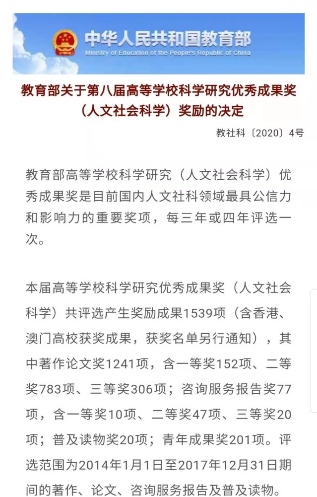 《教育部关于第八届高等公司科学研究优秀成果奖(人文社会科学)奖励的决定》日前发布。经专家评审,面向社会公示,奖励委员会审议通过和教育部批准,共有1539项成果获奖。