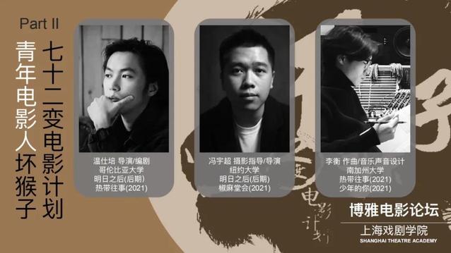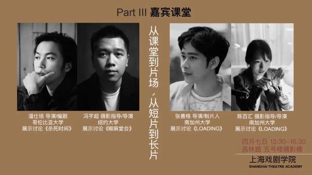 明天(4月7日)13:30-16:30,在昌林路校区 五号楼摄影棚还将进行嘉宾课堂。温仕培、冯宇超、张善格、陈百汇四位青年电影人将为同学们分享更多创作细节。欢迎各位老师同学们参加。