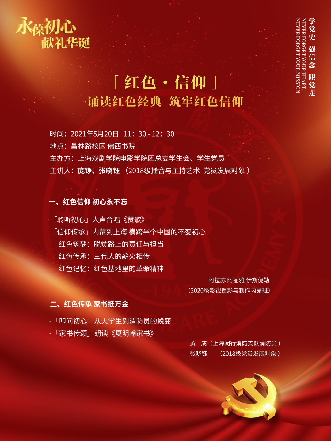 今年恰逢建党百年,广大青年既是追梦者,也是圆梦人,生逢其时,也重任在肩。本次访谈节目由党员发展对象2018级播音与主持艺术专业的庞铮和张晓钰同学作为主讲人,邀请了三位来自内蒙古的青年代表和来自上海消防的青年消防员黄成进行初心分享。