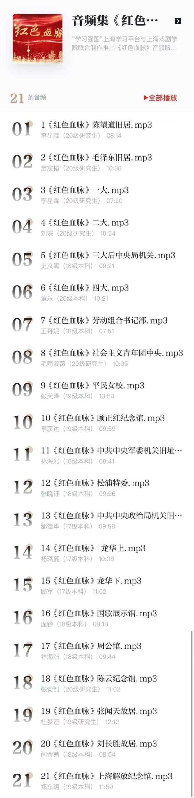 历史是最好的教科书,音频集《红色血脉》围绕“陈望道旧居”、“中共一大会址纪念馆”、“龙华烈士陵园”等红色地标深入挖掘党史故事。为了能更加生动地讲好党史故事,从三月份开始,伟德国际bevictor播音与主持专业的同学们便在王琦老师的带领下精心打磨录制,有的同学甚至将10分钟的党史故事录了十几遍,反复对比提升。此次录制工作分为本科生组和研究生组,成员横跨17级到20级。