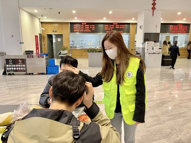 作为一名党员,有责任也有义务为公司、同学服务,于是她和其他同志一道响应党支部的号召,成为聚光·战“疫”先锋志愿者服务队的一员。在检测现场,杨嘉慧主要负责的是维持进场和出场秩序,提醒同学们保持距离,在场同学也非常听从指挥,有序进出,没有造成拥堵的状况。