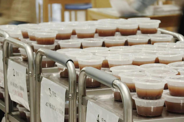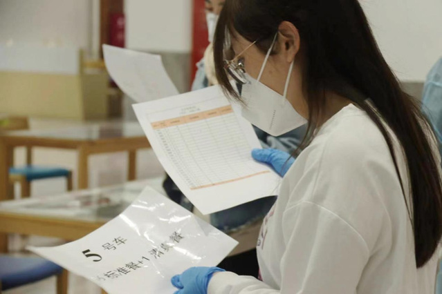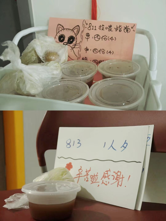 送餐按照楼层进行发放,两名志愿者为一组,一名负责发放固定数量的标准餐和筷子,另一名负责发放米饭和水果。并且确保在二十分钟内,高效有序地将所有标准餐发放完毕,配合默契,做到“0接触”“0失误”。