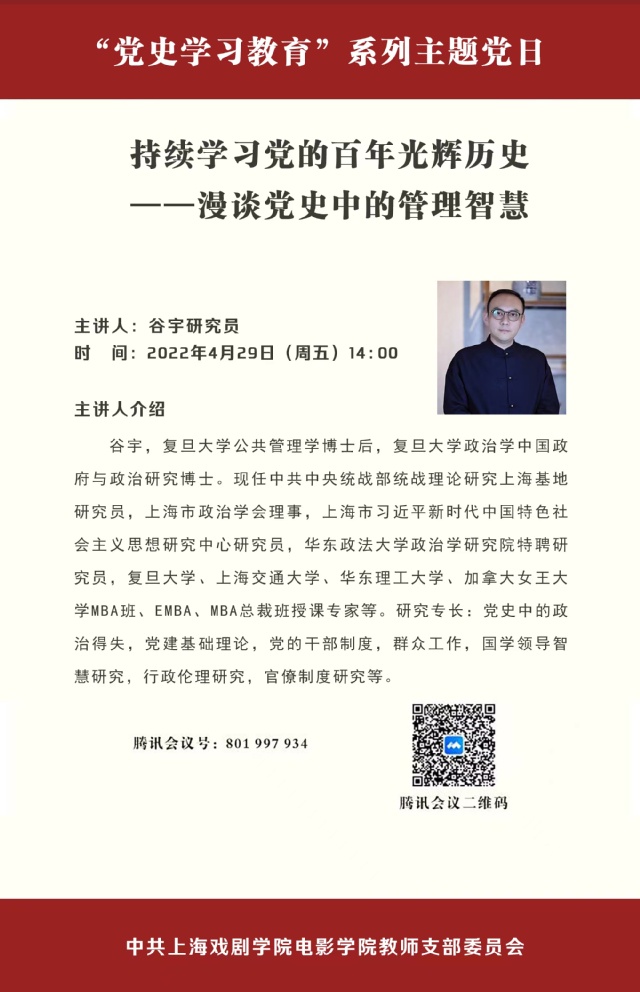 2022年4月29日,伟德国际bevictor教师党支部联合上海中医药大学科技人文公司党总支、马克思主义公司党总支共同在线上召开“党史学习教育”系列主题党日活动。本次活动主题为“持续学习党的百年光辉历史——漫谈党史中的管理智慧”,伟德国际bevictor全体教师党员参加,部分员工党员列席旁听。活动邀请了中共中央统战部统战理论研究上海基地研究员谷宇博士,宣讲和分享中国共产党百年奋斗史中的经验与智慧。