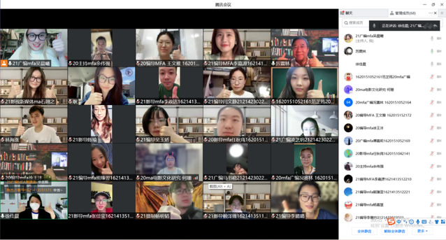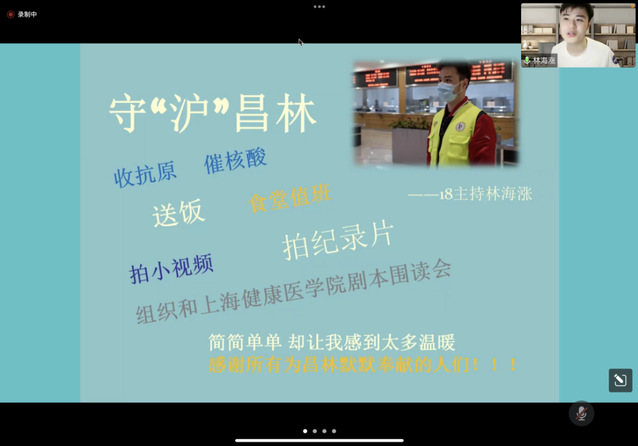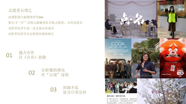 志愿者石翊之通过“通力合作,以《点名》致敬” 、“让影像的感动在‘云端’延续”、“阵脚不乱,驻守日常宣传”、“成为‘密接’的十四天”这四个方面,给大家分享了她的工作和经历。一方面,作为聚光·守“沪”昌林志愿服务队新闻宣传组组长的她,在食堂站过岗、在宿舍敲过门,写过稿子、拍过片子、放过电影,她说她也只不过是“聚光”先锋志愿者队伍里最普通最平凡的一个。另一方面,她也有了一段成为“密接”的特殊经历,她说,“当我们无法作为志愿者在一线抗疫,那能做的就是保护好自己,配合防疫工作,这也是一份可贵的责任。终于回到了五楼原寝,几经周折,百感交集,千言万语汇成了几个词,珍惜当下,守住绿码,坚持到底,云开见日。”
