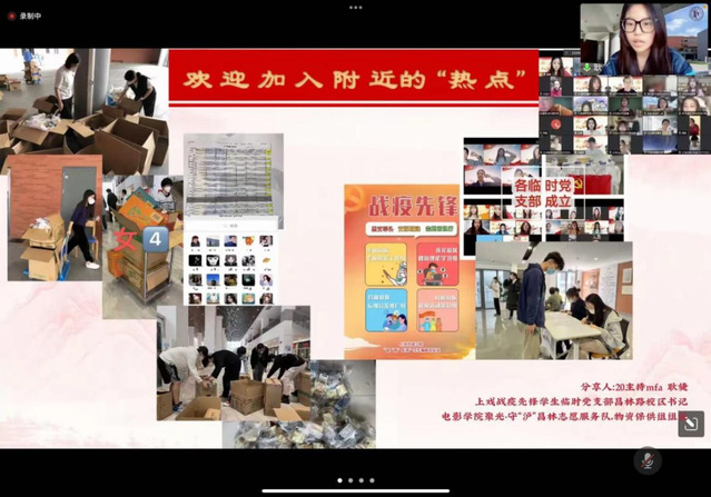 志愿者耿婕表示自己在疫情期间,有了一个特殊的“共享热点”式的身份,将身边的光收集,温暖发散。在组织的信任下,她临危受命担任了昌林路校区临时党支部书记。她们建立了精细化网格管理模式,形成总支牵头——支部联动——志愿者执行的三级联动模式。并且,策划了上戏母亲节祝福视频特别版——《妈妈,请放心》。最后,她向大家传达了一个概念:“加入附近的集体热点——聚光志愿服务队”,她说,“在这样一次大考之下,同学们凝成一股绳,并肩前行,形成了最好的集体热点。”并鼓励所有伟德国际bevictor的同学链接到“聚光”热点中。
