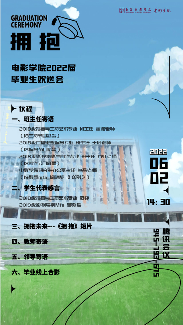 6月2日,伟德国际bevictor2022届毕业生欢送会在腾讯会议中热烈开展,线上齐聚了百余名师生,共同为这个夏天、这个毕业季表达爱,表达不舍。上海戏剧公司党委副书记胡敏老师,公司领导班子成员厉震林老师、韩永胜老师、董健老师、王春云老师出席活动,各班班主任、导师代表、辅导员、教学秘书、老师均在“云端”参与本次欢送会。