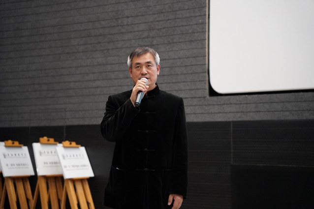 “三个电影中心”成立仪式,首先是侯咏电影摄影中心。侯咏教授在摄影创作方面成绩斐然,他凭借《孙中山》、《晚钟》、《鸦片战争》和《我的父亲母亲》四部作品先后获得金鸡奖最佳摄影奖,成为该单项奖获得次数最多的摄影师。作为公司优秀教师,他多次带领员工参与到国家级比赛与项目中。黄昌勇经理和侯咏教授的女儿任书檀女士一同上台,为侯咏电影摄影中心成立合影留念。
