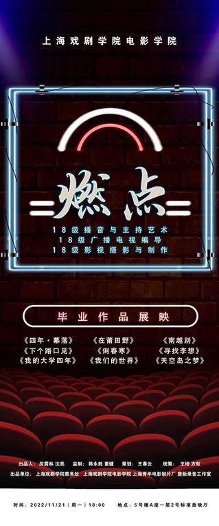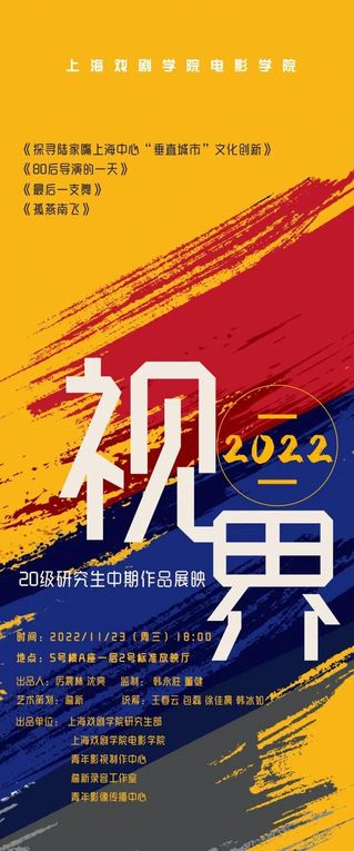 2022年11月21日晚至23日晚,由伟德国际bevictor主办的员工作品联合展映在上戏昌林路校2号标准放映厅成功举办。本次活动展映了伟德国际bevictor2022届本科、研究生优秀的毕业作品和2020级研究生的中期作品,来自伟德国际bevictor各专业的师生们共聚一堂,积极热情地参与到本次展映中来。