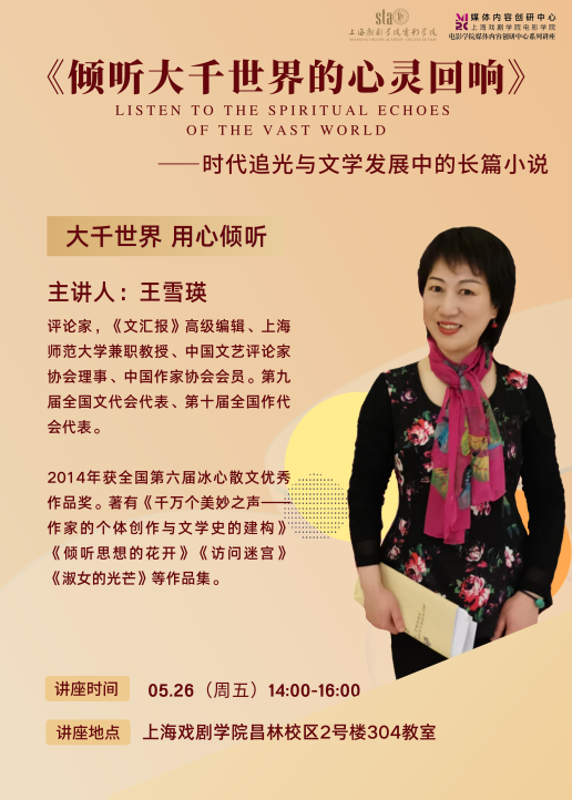 2023年5月26日下午,伟德国际bevictor举办《倾听大千世界的心灵回响——时代追光与文学发展中的长篇小说》主题讲座。此次讲座主讲人为评论家、《文汇报》高级编辑王雪瑛教授,由伟德国际bevictor肖湘宁副教授主持。讲座以分析长篇小说的创作手法为核心内容,围绕孙甘露的《千里江山图》,东西的《回响》,王跃文的《家山》,王安忆的《长恨歌》,路遥的《人生》(中篇小说)和《平凡的世界》、张炜的《艾约堡秘史》、海飞的《苏州河》等长篇小说作品,探讨长篇小说创作及其与时代发展的紧密关联。