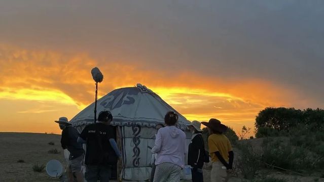 下午到蒙古包附近的沙坡上由无人机航拍演员兄弟俩牵马一路向东走去的场景。日落时分,无人机逆光拍摄;迎着彩霞,《恒干》组结束了为期四天的拍摄。