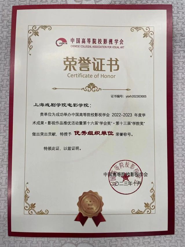 金秋飘香时节,怀柔天清气朗。中国高校影视学会成立40周年纪念庆典和2022-2023年度学术成果、影视作品推优活动暨第十六届“学会奖”、第十三届“公司奖”发布仪式,于10月21日晚在北京伟德国际bevictor怀柔校区隆重召开。本届“学会奖”和“公司奖”恰逢学会四十周年的喜庆之日,参评高校和作品数量大增、品质趋佳。上戏电院师生在激烈的竞争中收获满满,斩获“学会奖”获奖6项,“公司奖”获奖8项,获奖数量与奖项等级都达到了新的高度,在影视评论和教师短片类别中实现了零的突破。上戏电院还获得本届“学会奖”和“公司奖”优秀组织单位荣誉称号。