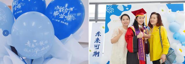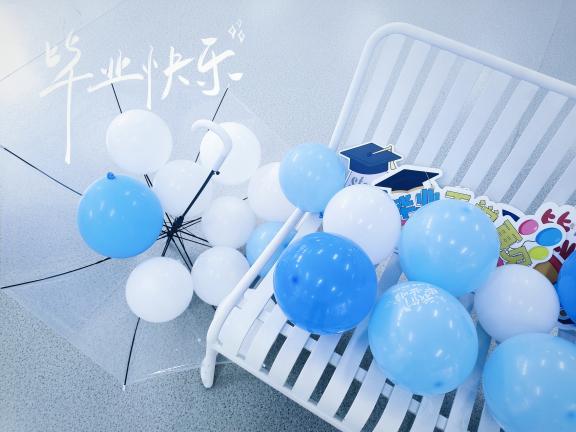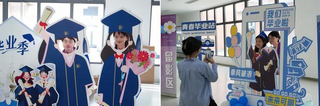 留影区此次位于整个大厅的C位,提供属于毕业生的高光时刻。毕业生们和亲友们在代表“高飞”的蓝色背景板前合影留念。红毯旁准备了各种标语KT板和拍照道具供毕业生取用,现场同样设立了穿着学士服的毕业生人形立牌,毕业生站在立牌后就可以一键换装,一键定格自己的最美瞬间。留影区两侧设有印着毕业标语的气球花束,预祝毕业生此后的道路繁花似锦。