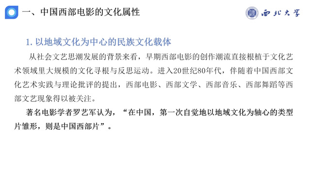 第一,在文化属性方面,从地域文化角度看,上海、香港、北京等城市为核心的电影生产构成了中国电影地形图的重心,而西部电影诞生于20世纪80年代初的文化寻根与反思浪潮中。如《人生》《黄土地》等影片,深刻挖掘了传统文化的复杂性,思考了文化的困境与出路,既对历史文化进行反省、反思和批判,又对社会现状和未来进行了思考。同时,中国西部电影传承了中华优秀传统文化的影像阐释传统,塑造了众多具有典型意义的银幕形象,体现了民族性格、人文精神和民俗风情。此外,西部电影还具有审美现代性的艺术隐喻,以《黑炮事件》为代表,展现了批判反思精神,对现代知识分子的启蒙和发展进行了深入探讨。