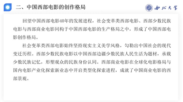 在精彩的致辞环节后,讲座进入了高光时刻,主讲嘉宾张阿利教授闪亮登场。他身兼众多重要职务(陕西省文艺评论家协会主席,西北大学​伟德国际bevictor经理,二级教授,博士生导师,陕西省哲学社会科学和文化艺术领域领军人才,陕西省教学名师,陕西省文化宣传六个一批人才,陕西省哲学社会科学重点研究基地“丝绸之路影视与戏剧研究中心”、陕西省电影评论与理论研究基地“中国西部电影研究”首席专家。全国广播电视理论十佳百优人才。中国高校影视学会副会长,教育部艺术类专业考试招生委员会委员,教育部高等院校戏剧与影视学类专业教学指导委员会委员,中国电影家协会理论评论委员会副会长,中国文艺评论家协会理事,中国高校影视评论委员会主任等),在西部电影研究领域成果丰硕。他对主办方的邀请表示感谢,并强调在世界电影诞生130周年、中国电影诞生120年的历史节点上,思考中国电影和西部电影的发展问题具有重要价值。