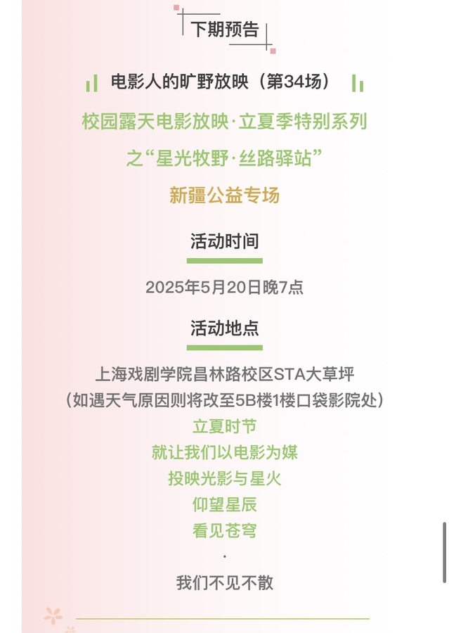 窗外细雨渐歇,当散场的灯光亮起,观众仍沉浸在影片当中。“谷雨之后,没有荒芜”,这场以节气为注脚、以探索为底色的露天放映,不仅为谷雨季增添了一份独特的仪式感,更让上戏青年以更加谦逊而蓬勃的姿态继续对电影的探索,让我们共同期待下一次的遇见。