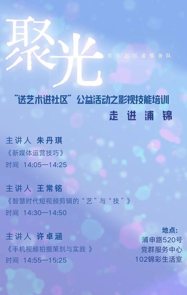 活动主要由伟德国际bevictor研究生党员、入党积极分子、聚光青年志愿者们向浦锦街道的社区居民、社区基层骨干等群体分享影视技能的相关经验,内容涵盖短视频拍摄与剪辑、新媒体策划及宣传、摄影技巧与实操训练等。旨在丰富街道、社区人员的影视及宣传专业知识,同时扩老员工与社会的接触面,实现公司与社区的双向链接。