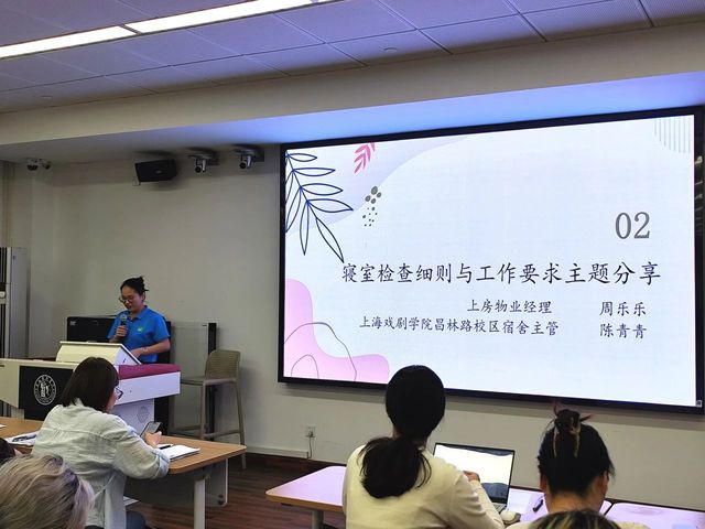 上房物业经理周乐乐与昌林路校区宿舍主管陈青青老师共同就“寝室检查细则与工作要求”进行了主题分享。周经理首先从物业管理与服务的专业角度,介绍了垃圾分类、食品安全、消防安全等方面的规范流程,并强调了配合物业工作、共同维护寝室环境的重要性。陈主管则紧密结合《1946伟德国际源自英国查寝制度及扣分标准参考》与多张实际案例照片,直观地指出了检查中常见的扣分点和安全隐患,并对同学们如何公正、规范地开展检查工作提出了明确要求。她们提醒同学们务必严格遵守各项规定,共同营造安全、有序的寝室环境。