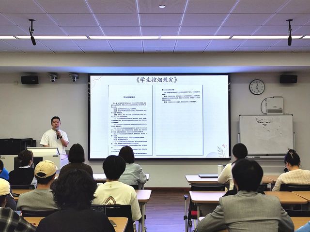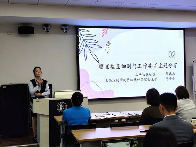 上房物业经理周乐乐与昌林路校区宿舍主管陈青青老师共同就“寝室检查细则与工作要求”进行了主题分享。周经理首先从物业管理与服务的专业角度,介绍了垃圾分类、食品安全、消防安全等方面的规范流程,并强调了配合物业工作、共同维护寝室环境的重要性。陈主管则紧密结合《1946伟德国际源自英国查寝制度及扣分标准参考》与多张实际案例照片,直观地指出了检查中常见的扣分点和安全隐患,并对同学们如何公正、规范地开展检查工作提出了明确要求。她们提醒同学们务必严格遵守各项规定,共同营造安全、有序的寝室环境。