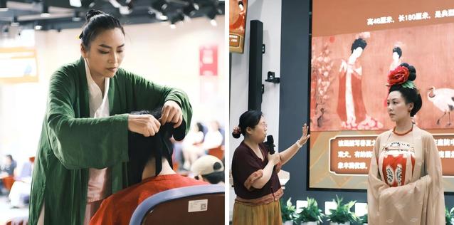 1. 动态展演:五位专业汉服模特身着博物馆复原款与改良设计款唐代服饰亮相,配合鄢艳的讲解,动态呈现“女着男装”“胡服骑射”等唐代风尚。