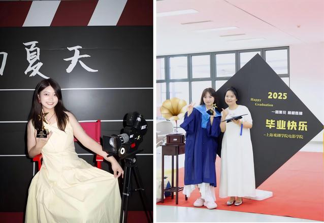 辅导员赠予的小金杯是电影人的嘉奖,毕业生踏着红毯、坐着导演椅、手捧金杯,按下属于自己人生电影的“Action”!现场欢声笑语不断,快门声此起彼伏,每个人都在充满电影氛围的留影区,定格下属于自己毕业季的高光时刻,也圆了一场温馨的电影人之梦。