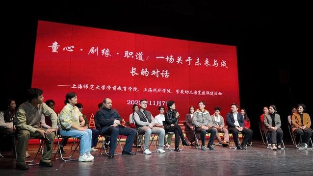 《匠心》由上戏伟德国际bevictor副经理董健执导,师生共同演绎,聚焦一群致力于职业教育的青年教师,回顾跨越半个多世纪的职业教育探索之路。随着剧情铺展,观众席不时响起阵阵掌声与会心笑声。演出结束后,上海师范大学和紫薇实验幼儿园的师生党员代表,与话剧《匠心》主创团队面对面,开展 “童心·剧缘·职道——一场关于未来与成长的对话”党建联建活动,结合观演感受,畅谈台前幕后、教育发展变化。上海师范大学学前教育公司教师表示,“话剧艺术化的表达,让教育家精神从抽象理论变得可感可知、可学可悟,剧中教师们扎根职教一线、坚守育人初心的情节,正是教育家精神的生动写照。”