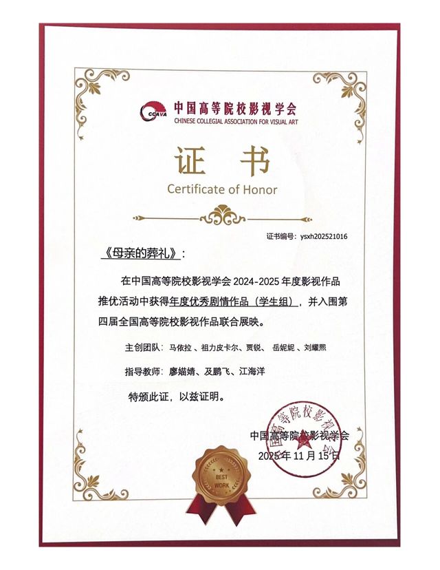 《母亲的葬礼》主创团队:马依拉、祖力皮卡尔、贾锐、岳妮妮、刘耀熙;指导教师:廖媌婧、及鹏飞、江海洋。